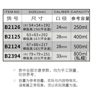 B2126-250ML/B2125-400ML/B2124-500ML/B2394-800ML