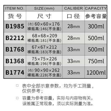 B1985-300ML/B2212-500ML/B1768-500ML/B1368-750ML/B1774-1200ML