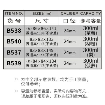 B538-300ML(草莓)/B540-300ML(柳橙)/B537-300ML(梨)/B539-300ML(菠萝)